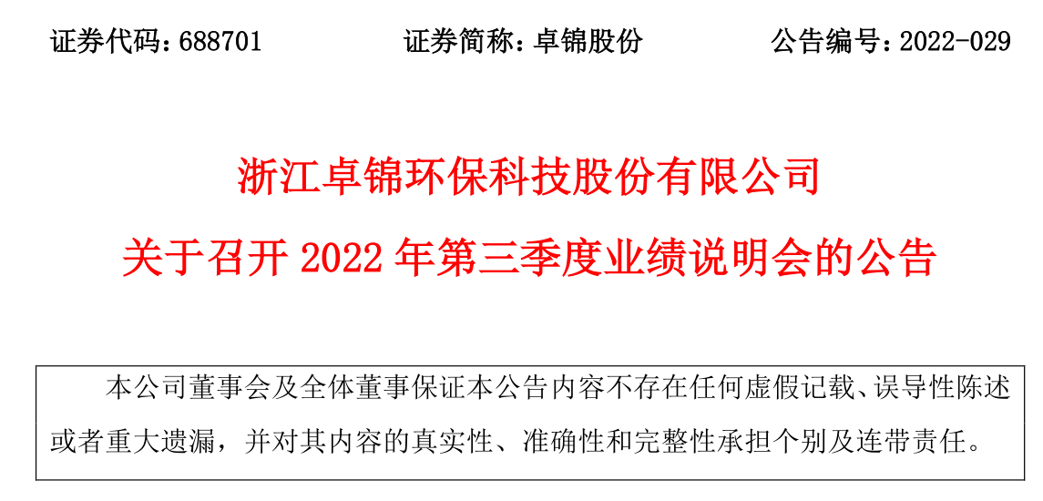 浙江卓錦環??萍脊煞萦邢薰娟P于召開2022年第三季度業績說明會的公告