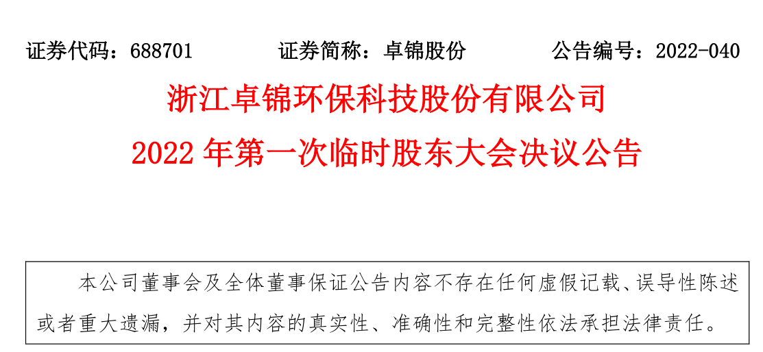 卓錦股份 2022年第一次臨時股東大會決議公告