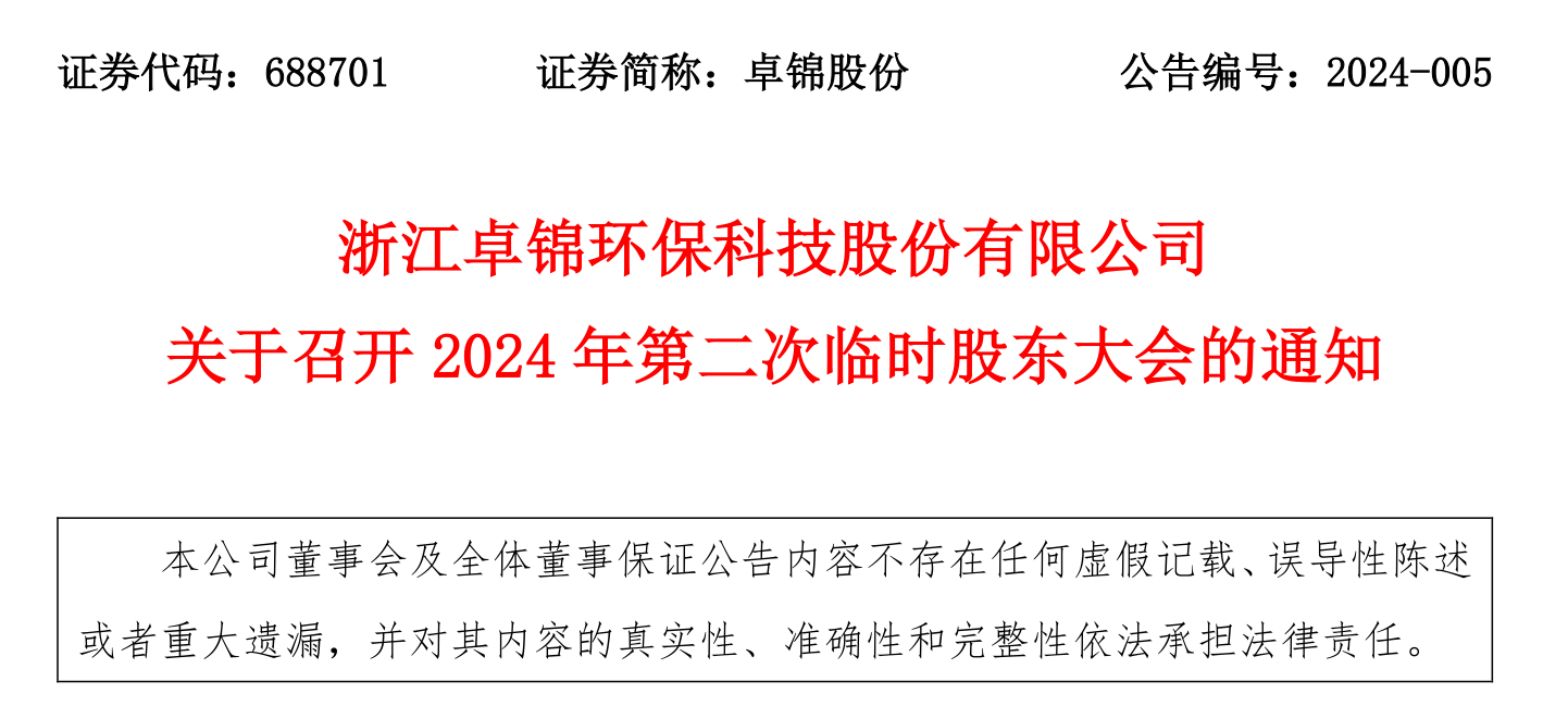 浙江卓錦環保科技股份有限公司關于召開2024年第二次臨時股東大會的通知