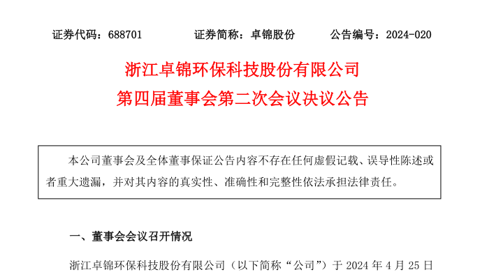 浙江卓錦環保科技股份有限公司第四屆董事會第二次會議決議公告