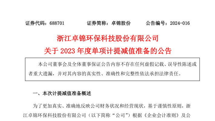浙江卓錦環保科技股份有限公司關于2023年度單項計提減值準備的公告