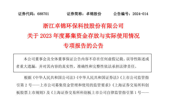 浙江卓錦環保科技股份有限公司關于2023年度募集資金存放與實際使用情況專項報告的公告