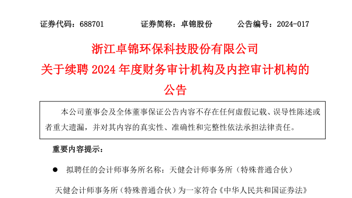 浙江卓錦環(huán)保科技股份有限公司關于續(xù)聘2024年度財務審計機構及內(nèi)控審計機構的公告