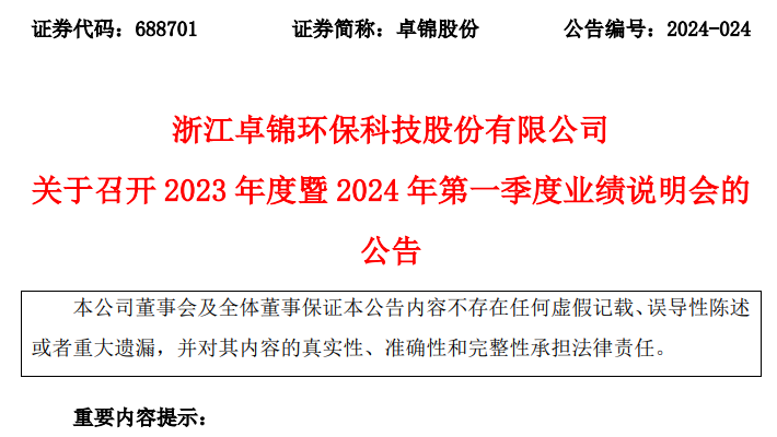 關(guān)于召開 2023 年度暨 2024 年第一季度業(yè)績說明會的公告