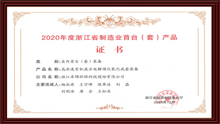 高濃度有機廢水電解催化氧化成套裝備入選2020年度浙江省裝備制造業重點領域首臺(套)產品